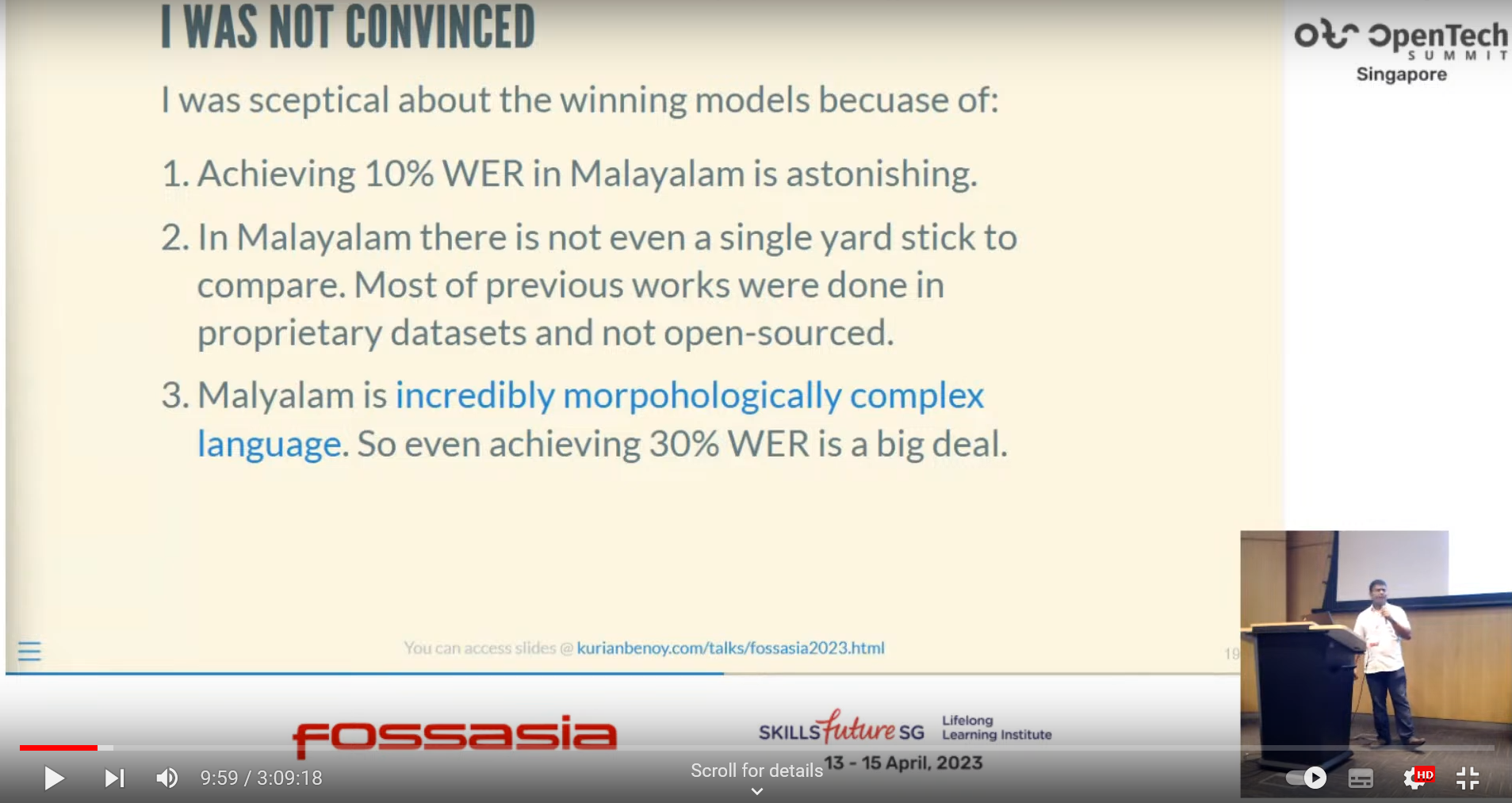 I talked about what is OpenAI whisper and some of it’s amazing feature. I highlighted the importance of fine-tuning Whisper in low-resource language like Malayalam which is able to get almost 90% accuracy compared to -10% accuracy of OpenAI whisper model weights. The results where calculated with a new github project called malayalam_asr_benchmarking created by me.