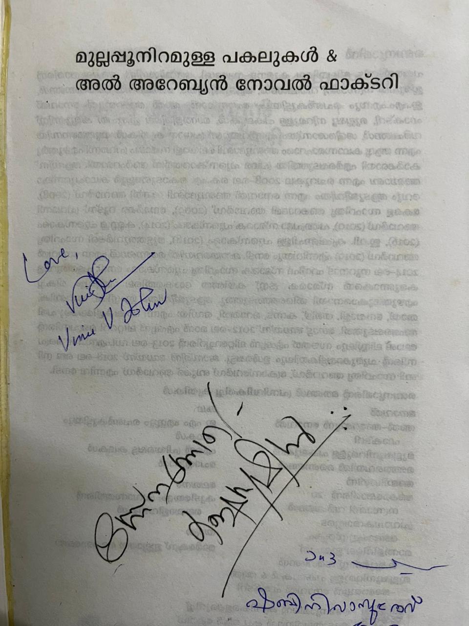 Yet I had just one wish. Benyamin is an author who has written lot of thriller novels like അൽ - അറേബ്യൻ നോവൽ ഫാക്ടറി and മുല്ലപ്പു നിറമുള്ള പകലുകൾ(which is a dual novel) along with the famous ആടു ജീവിതം(Goat Days). I just wanted to meet him in person and get an autograph on my copy of my favourite novel.