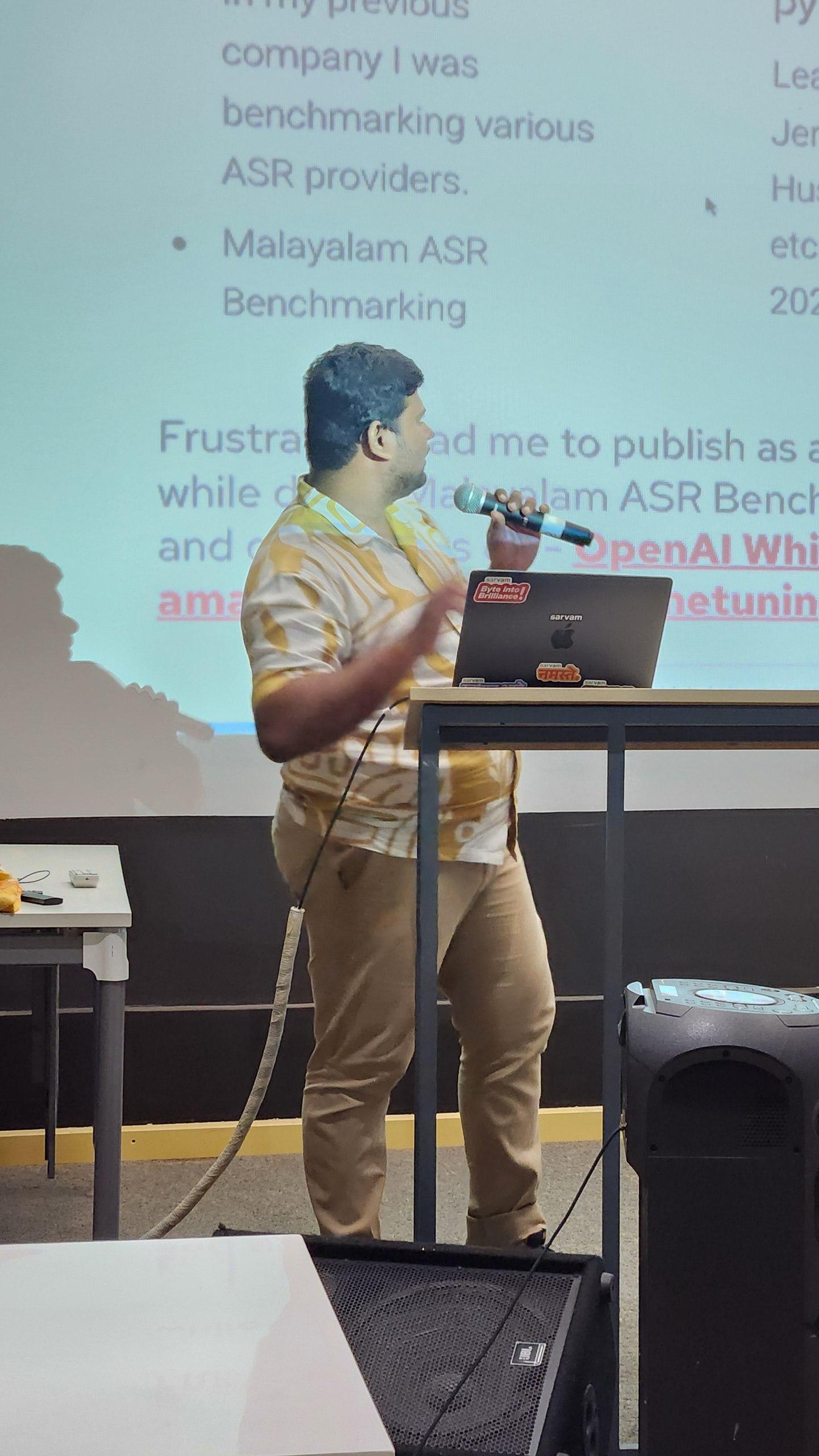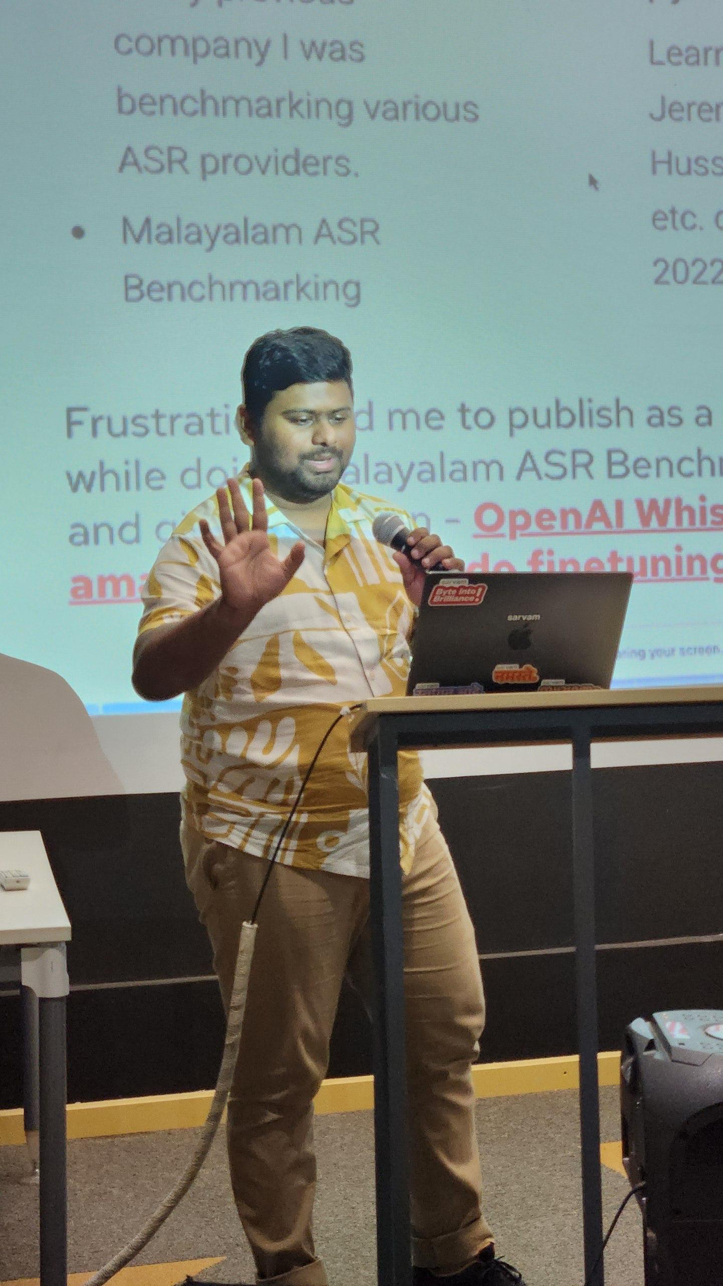 Talked about how the frustration of doing the same thing repeatedly led to the creation of the whisper-normalizer Python package. Since I was the first person to put it out in the world, it gained a lot of traction with over 1 million downloads, and factors like Google SEO and LLMs like Perplexity helped. Kavya Manohar and I identified some crucial bugs in the Malayalam Text Normalizer, which we later fixed, although it still requires further work. Towards the end, I shared some exclusive content about my speaking journey so far. I discussed how I started speaking at a small meetup in Kochi and have now spoken at multiple international conferences, including presenting three times at Pycon India by the age of 25.