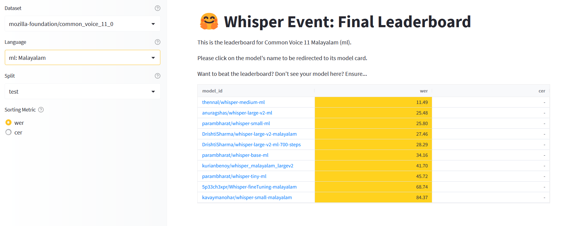 Malayalam models performance in whisper event according to leaderboard