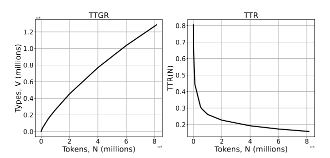 TTGR and TTR plot of Malayalam for SMC Corpus of Wikipedia text from K. Manohar et al.